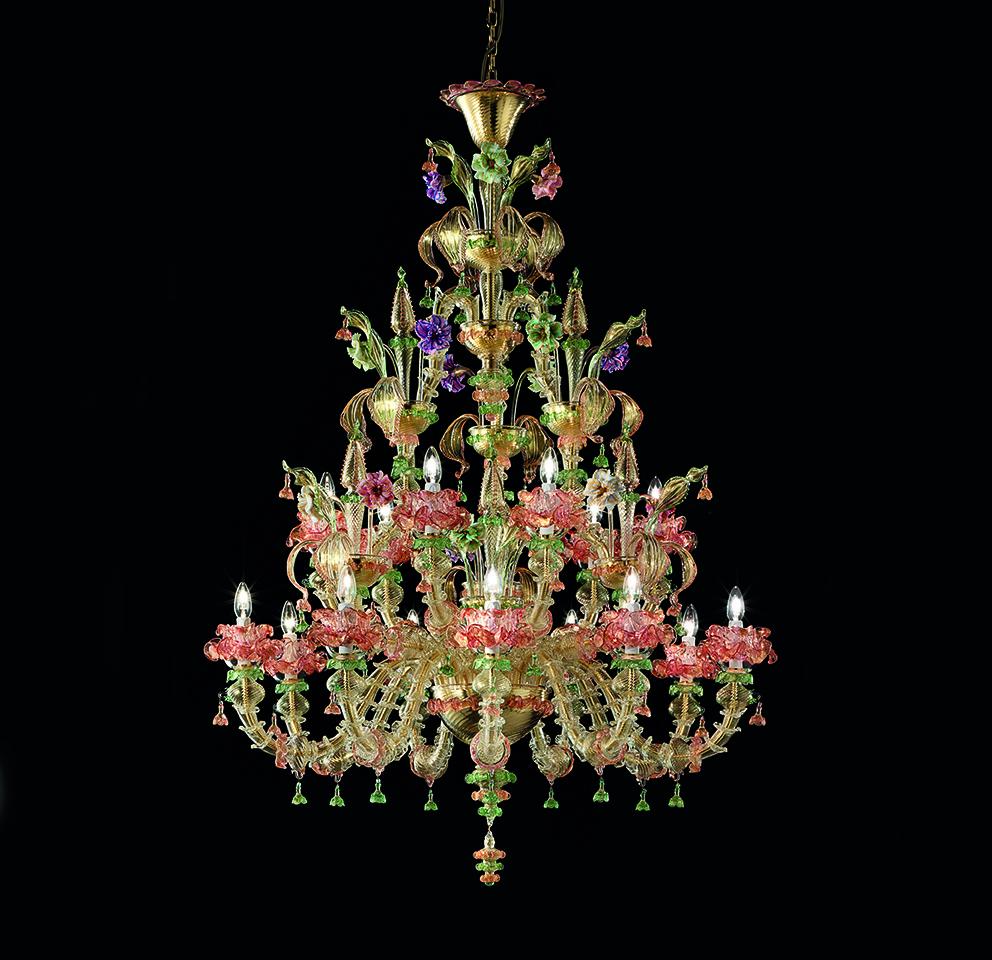 The type of chandelier that was very popular was called “Ciocca”, which literally translates to “bouquet of flowers”. Their shape was inspired by an original architectural concept: the interior space was left almost empty. The decorations were therefore distributed around the central support, spaced out by the length of the arms. Giuseppe Briati was one of the most famous chandelier manufacturers. In 1724 he created what became known as the Rezzonico Chandelier, the first chandelier of its kind. It was designed for the noble Venetian Rezzonico family and exhibited in their palazzo along the Grand Canal, now the famous Venetian museum “Ca’ Rezzonico”. With its multiple arms decorated with garlands, flowers and leaves, the Rezzonico Chandelier became the standard for what is now recognized as the classic Murano chandelier. Even today, Murano glass chandeliers are highly appreciated all over the world, and we at Edea Murano Chandelier contribute to distributing this type of artistic beauty by selecting the best glass production furnaces